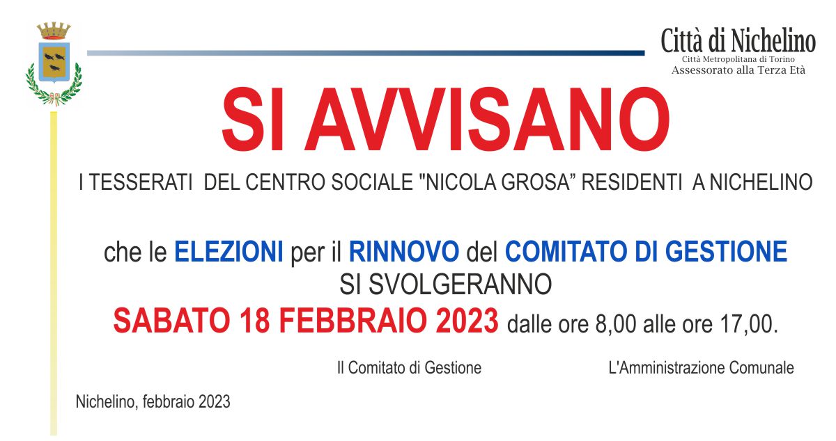 Si informa la cittadinanza che sabato 18 febbraio dalle 8.00 alle 17.00 tutti i nichelinesi over 55 potranno votare per il rinnovo del Comitato di Gestione recandosi presso il Centro “Nicola Grosa” di via Galimberti 3.