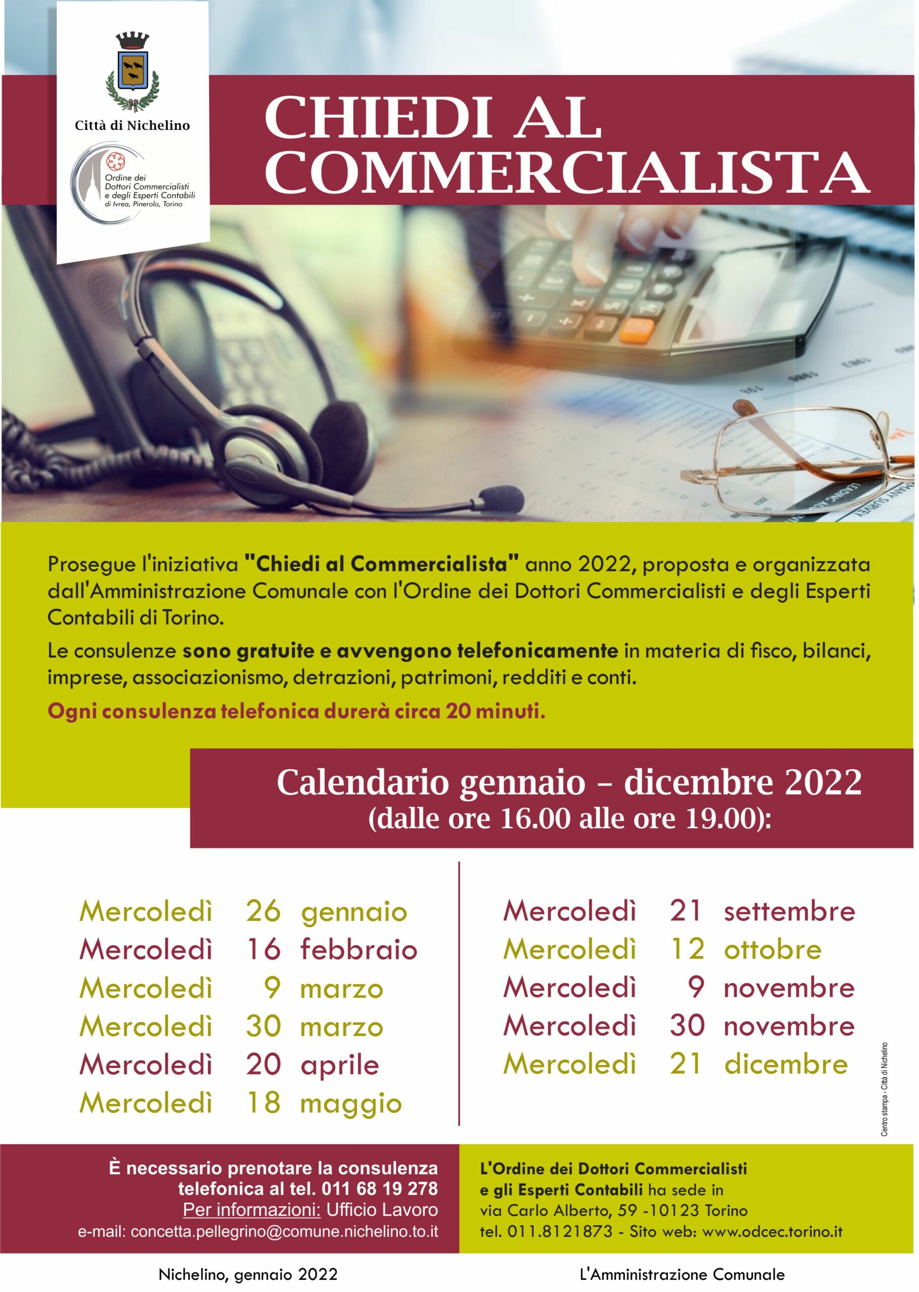 Ritorna l’iniziativa comunale “Chiedi al Commercialista”, siglata insieme all’Ordine dei Dottori Commercialisti e degli Esperti Contabili di Torino, che offre ai cittadini di Nichelino un calendario di 11 date (da gennaio a dicembre 2022) valide per consulenze gratuite su tematiche fiscali e contabili.