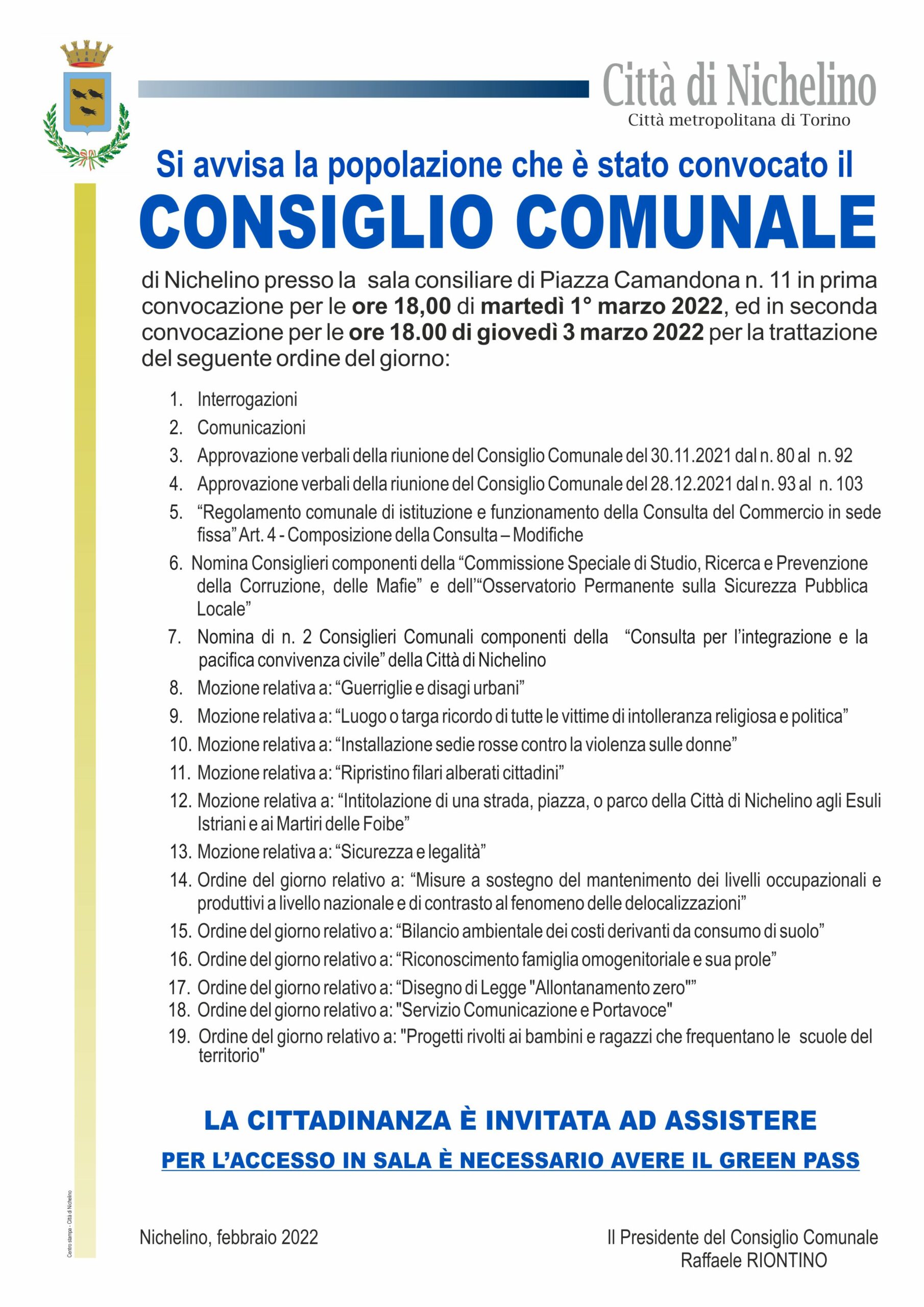 I cittadini son invitati a partecipare, ricordando che è necessario possedere il Green Pass per accedere alla sala.