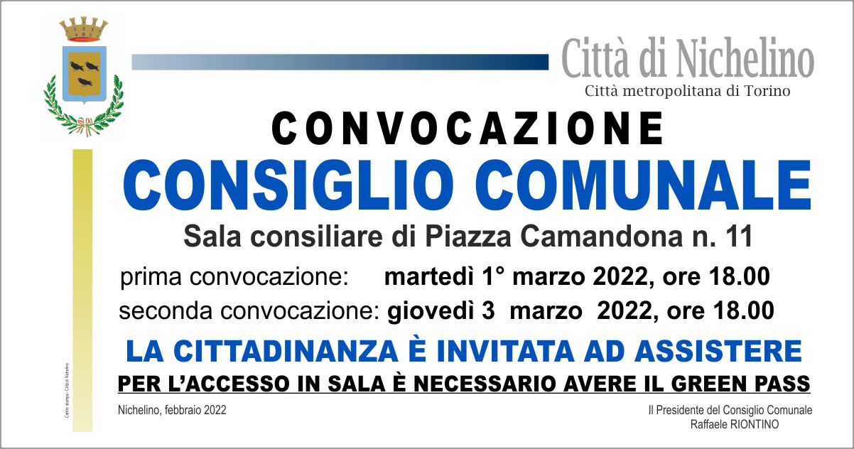Si avvisa la cittadinanza che è stato convocato il Consiglio Comunale di Nichelino presso la sala consiliare di Piazza Camandona 11.