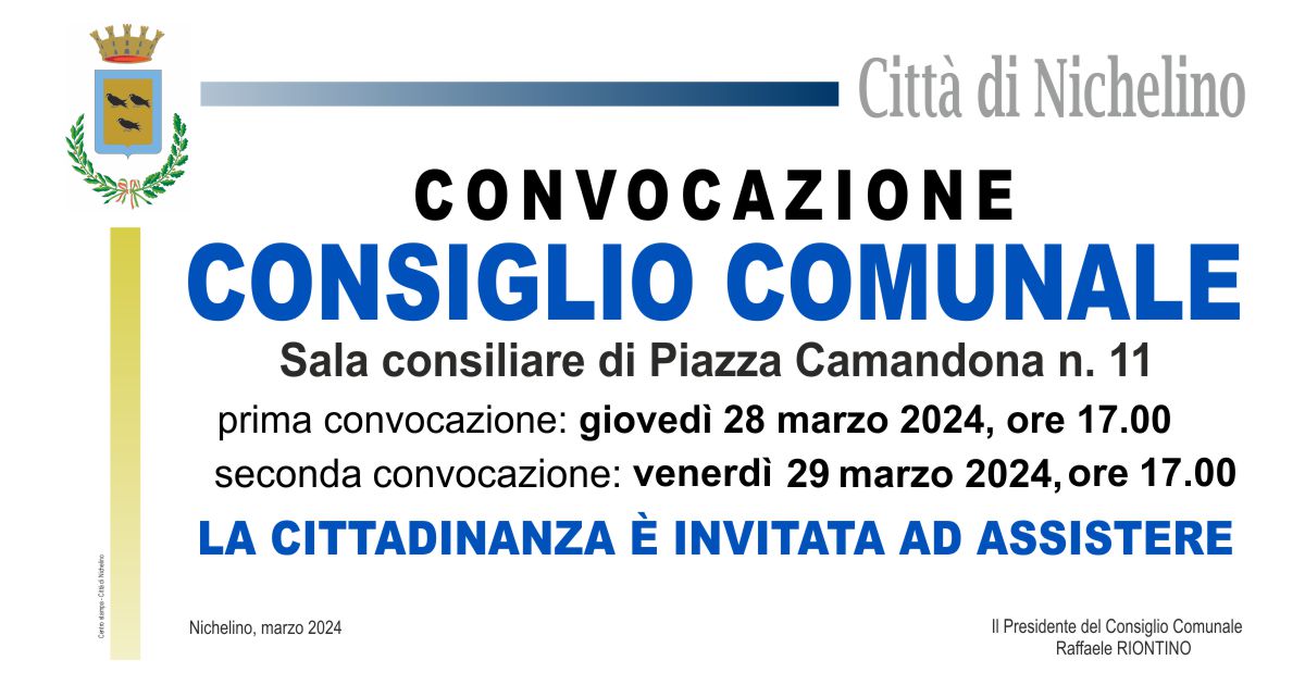 Si avvisa che è stato convocato il Consiglio Comunale di Nichelino presso la sala consiliare di Piazza Camandona 11.