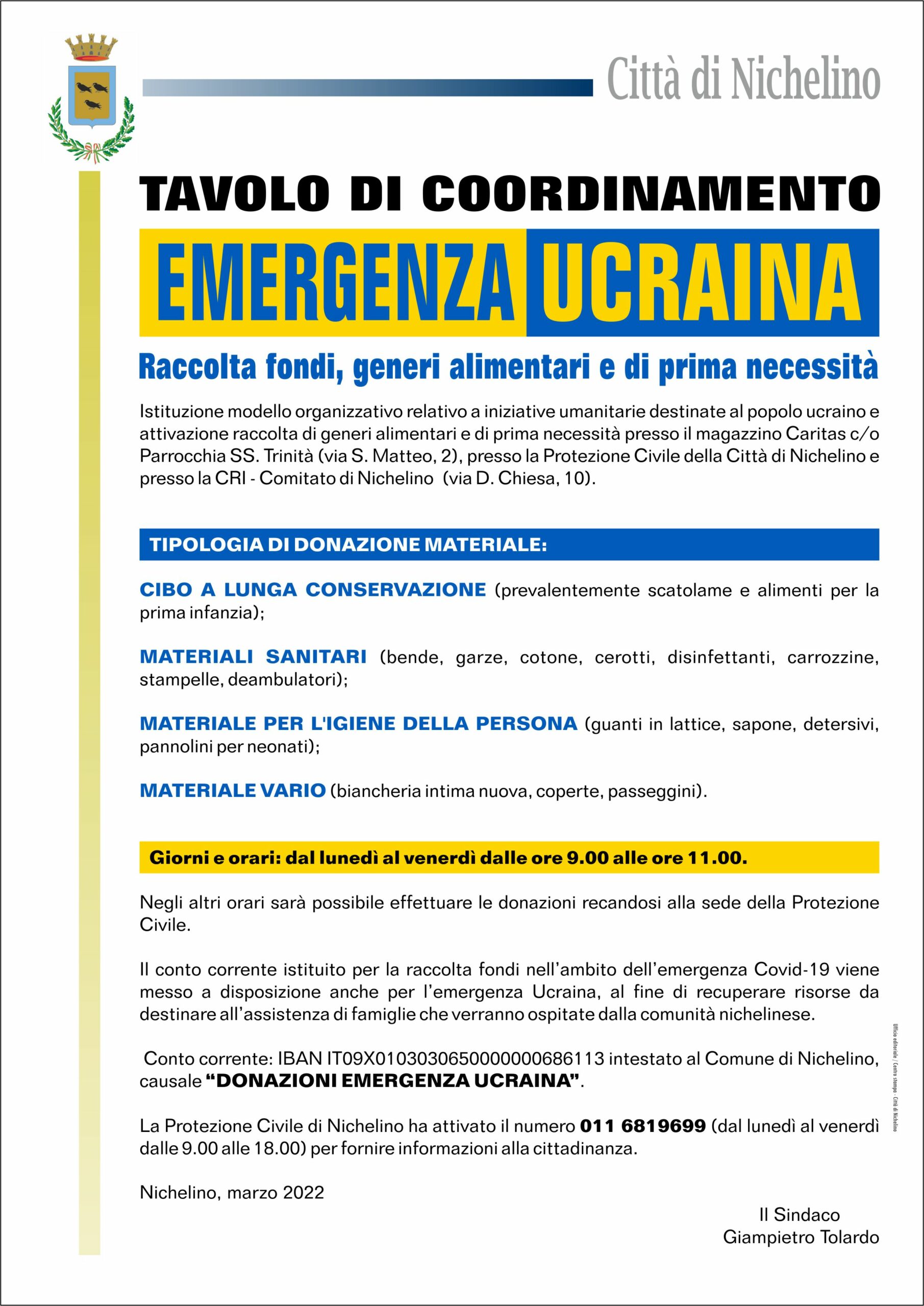 In relazione al tavolo di coordinamento per la gestione dell’emergenza umanitaria legata ai cittadini ucraini, istituito lo scorso giovedì 3 marzo 2022, l’Amministrazione Comunale della Città di Nichelino ha espresso la volontà di realizzare, in concerto con la Protezione Civile di Nichelino, un modello organizzativo condiviso con le associazioni e gli enti caritatevoli del territorio al fine di fornire informazioni ufficiali nell’ambito delle iniziative umanitarie verso il popolo ucraino.