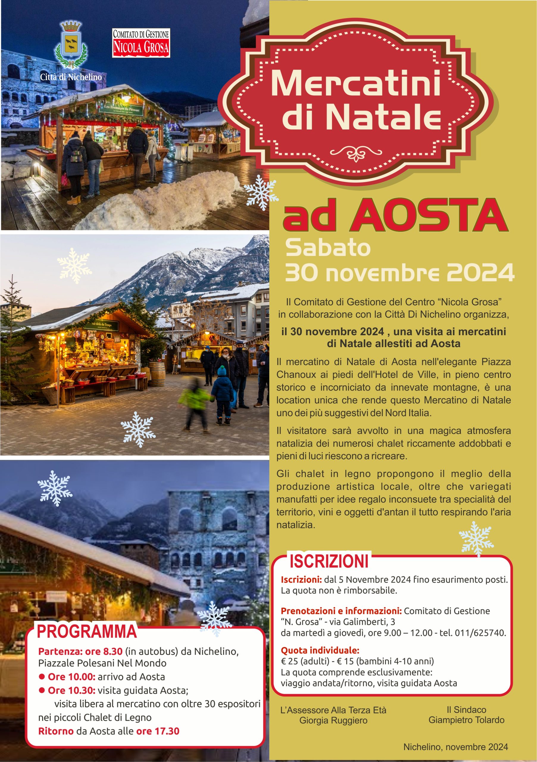 Si informa che a partire da oggi, martedì 5 novembre, sono aperte le iscrizioni per partecipare alla gita ai Mercatini di Natale di Aosta che si svolgerà sabato 30 novembre 2024.