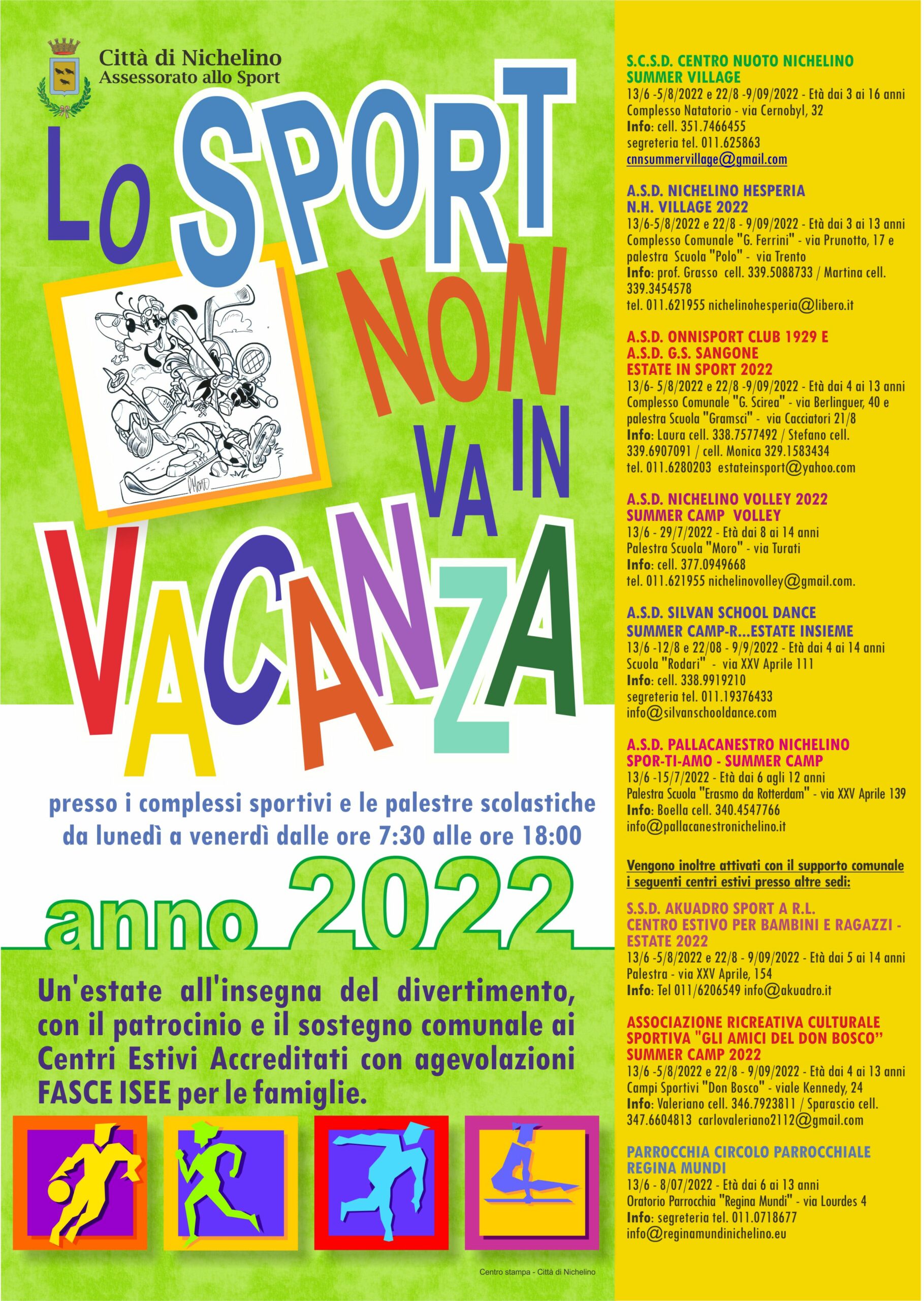 Si informano le famiglie che presso i complessi sportivi, le palestre scolastiche e private e le parrocchie della Città da lunedì a venerdì dalle ore 7:30 alle ore 18:00 a partire da lunedì 13 giugno 2022, ritorna "LO SPORT NON VA IN VACANZA".