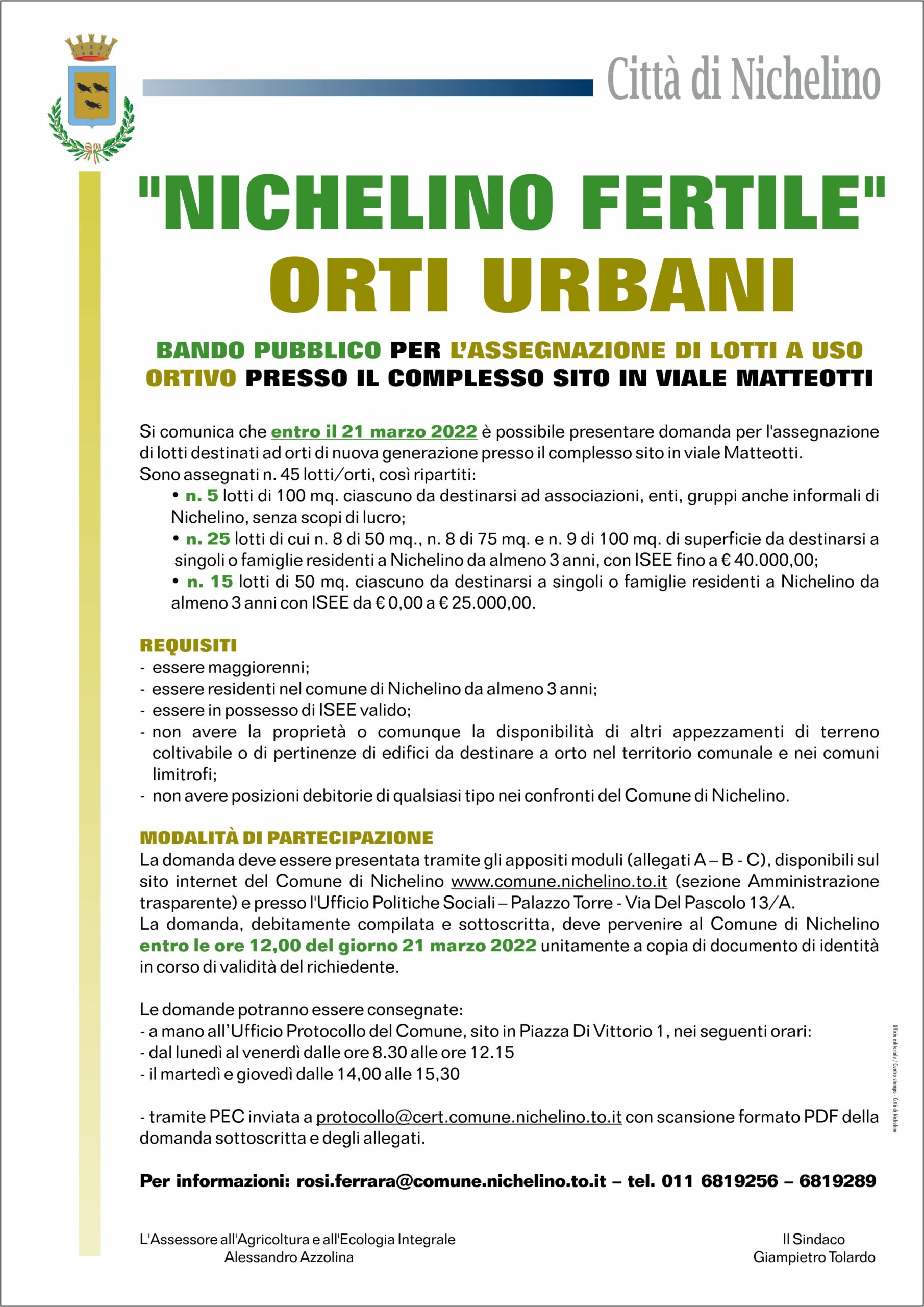 Si comunica la pubblicazione del bando relativo al progetto “Nichelino fertile” per l’assegnazione di n. 45 lotti a uso ortivo da destinarsi, con atto di comodato d’uso a titolo oneroso, a singoli/famiglie o associazioni, enti, gruppi informali residenti sul territorio comunale secondo la seguente ripartizione: