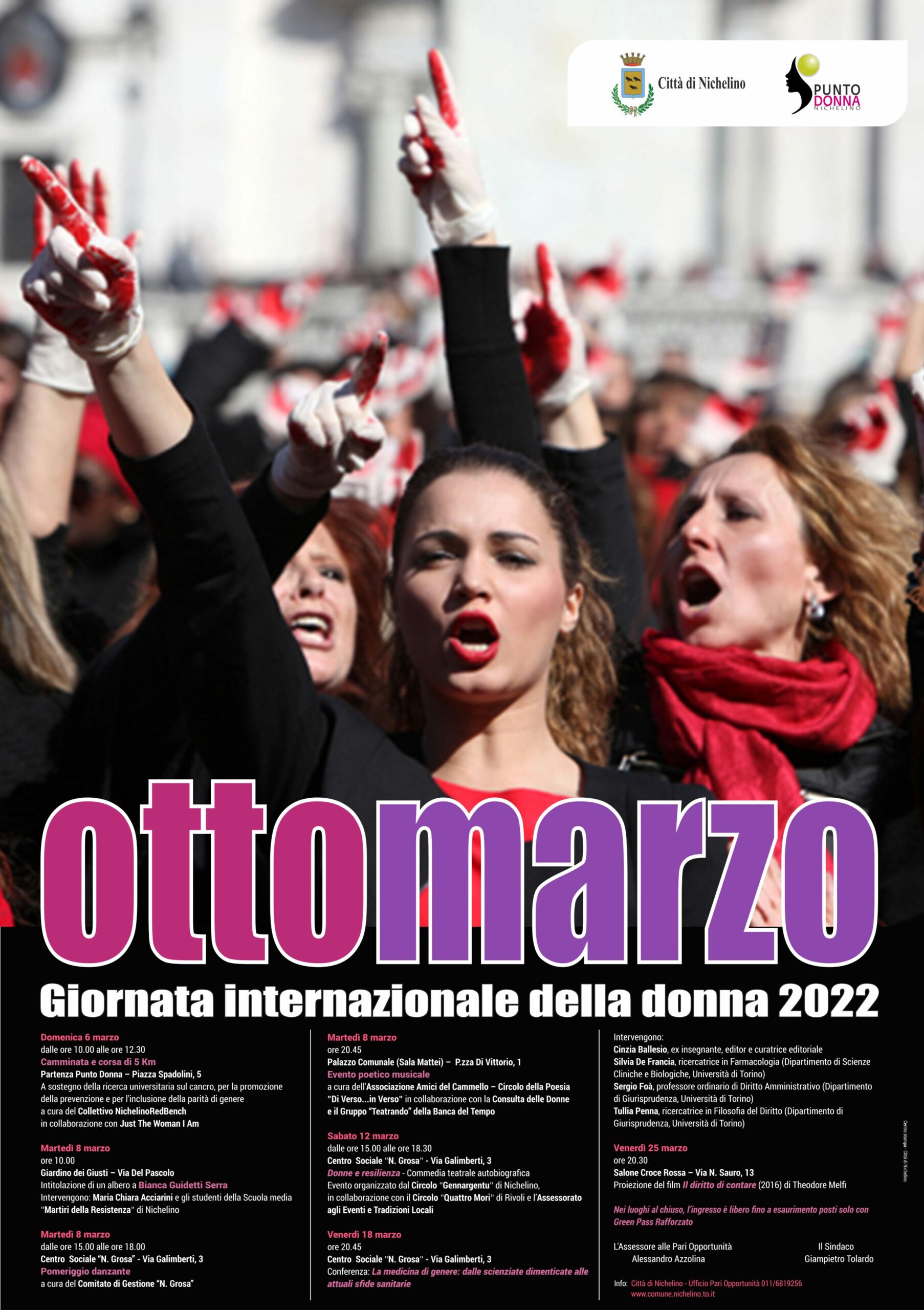 Infine, alle ore 20.45, presso la Sala Mattei del Palazzo Comunale (Piazza Di Vittorio, 1), è previsto l’Evento poetico musicale, a cura dell'Associazione Amici del Cammello - Circolo della Poesia “Di Verso...in Verso”, in collaborazione con la Consulta delle Donne e il Gruppo “Teatrando” della Banca del Tempo. - Sabato 12 marzo, dalle ore 15.00 alle ore 18.30, presso il Centro Sociale “N. Grosa”, andrà in scena Donne e resilienza, commedia teatrale autobiografica.