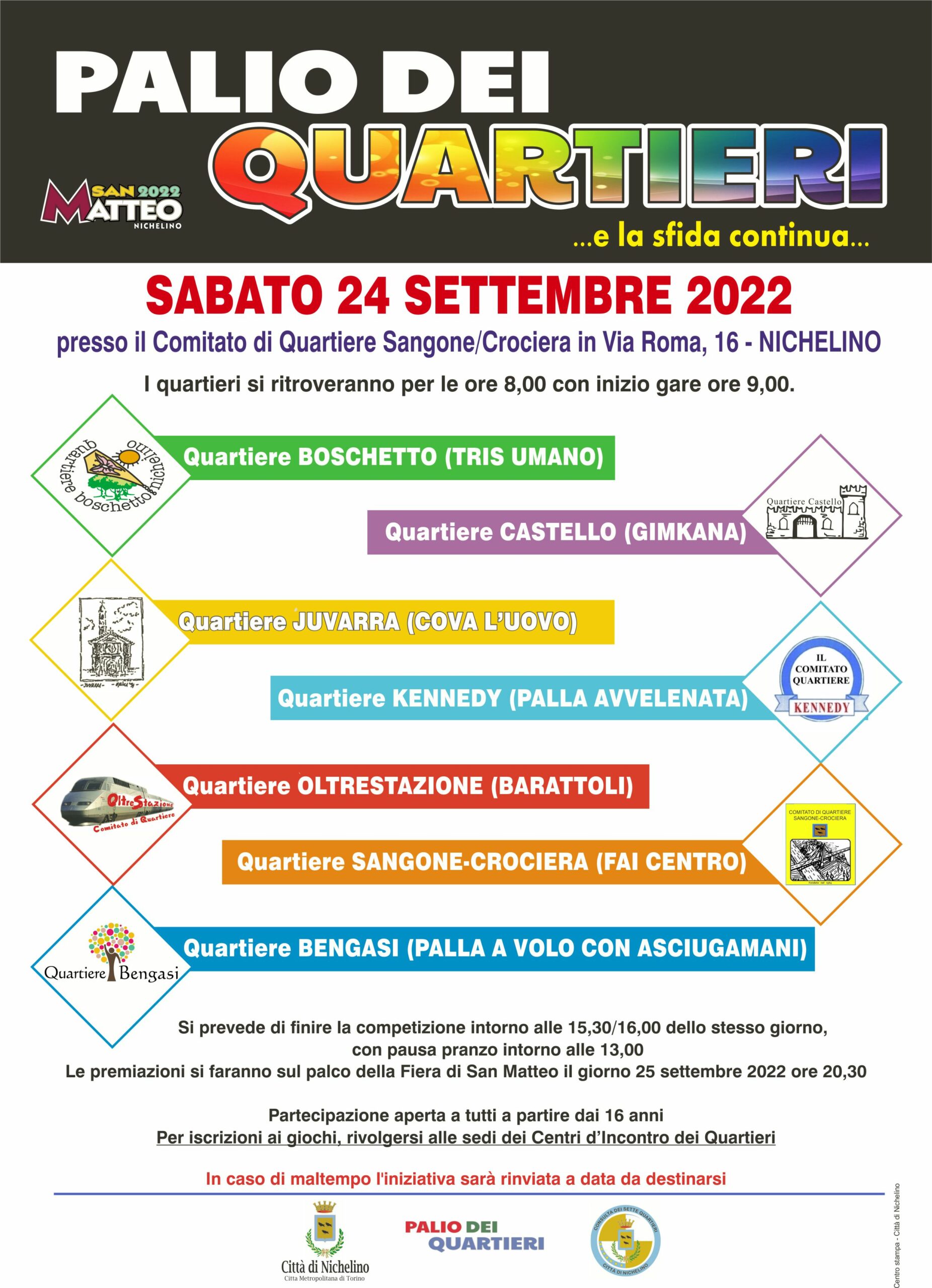 Sabato 24 settembre presso il Comitato di Quartiere Sangone/Crociera (via Roma, 16 Nichelino) si terrà il Palio dei Quartieri.