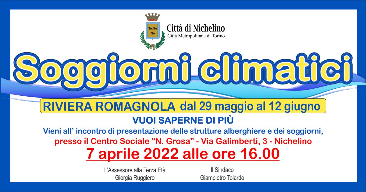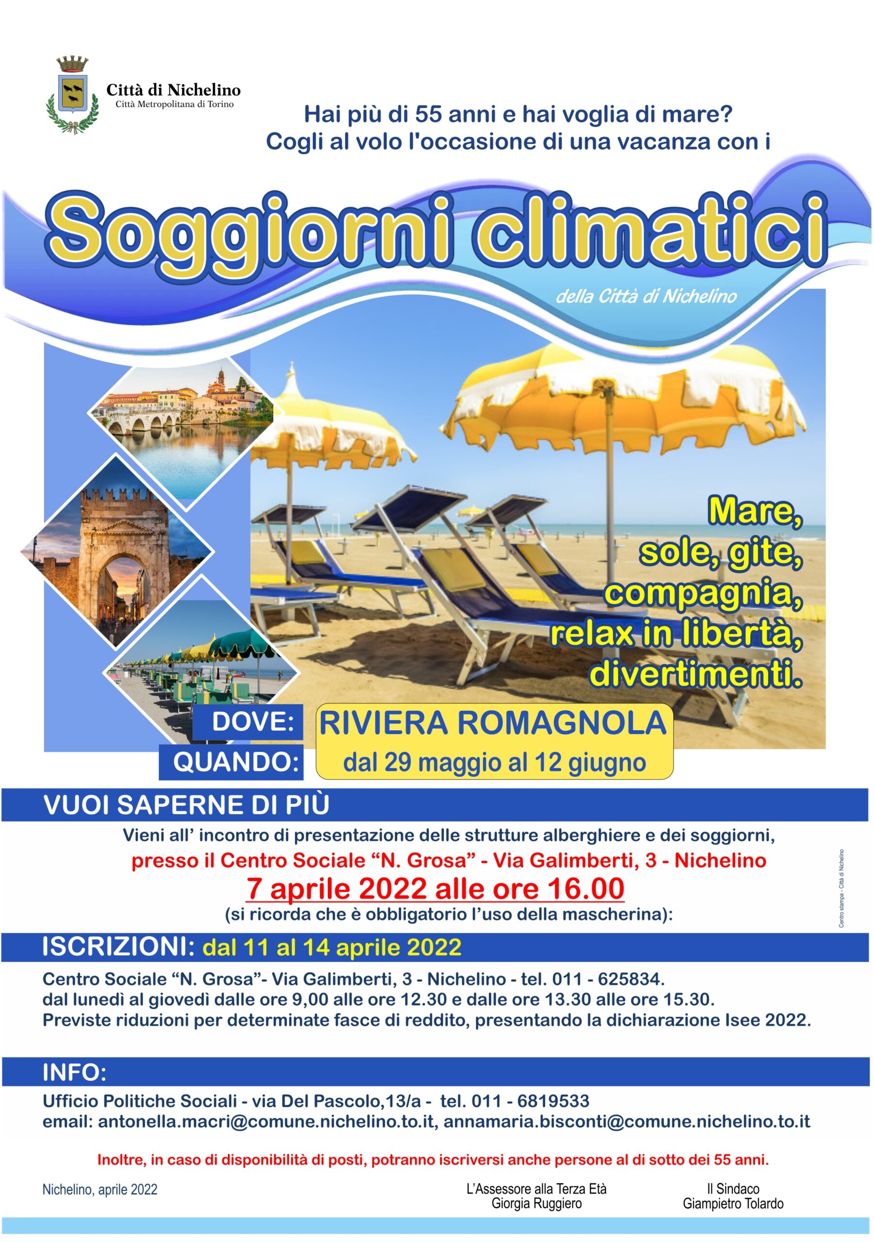 Si comunica che, in relazione all'iniziativa "Soggiorni climatici", dal 29 maggio al 12 giugno 2022, è in programma una trasferta nella riviera romagnola, con meta Rimini, dedicata a chi ha compiuto i 55 anni d'età.