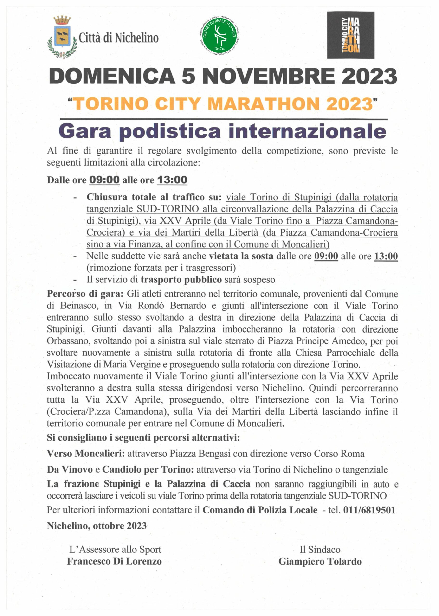 Domenica 5 novembre 2023 anche il comune di Nichelino sarà interessato dal passaggio degli atleti impegnati nella Torino City Marathon.